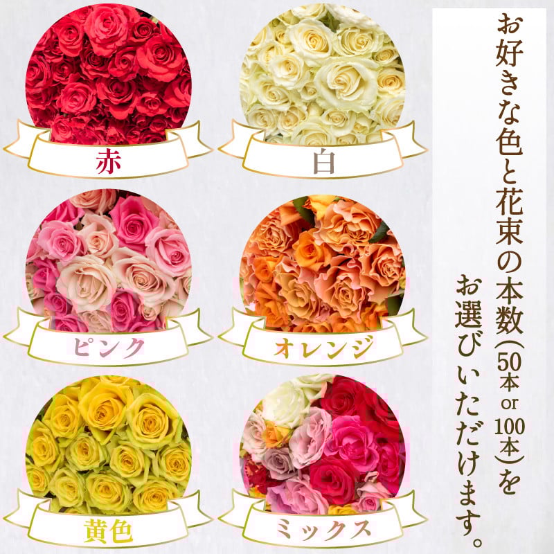バラ 花束 選べる 50本 100本 メッセージローズ 入り 色 赤 白 ピンク 黄色 オレンジ ミックス ( ギフト プレゼント 贈答 花 フラワー プロポーズ 記念日 お祝い 自然 贈り物 植物 ローズ 産地直送 お取り寄せ 癒やし 香り リラックス ) 下関 山口