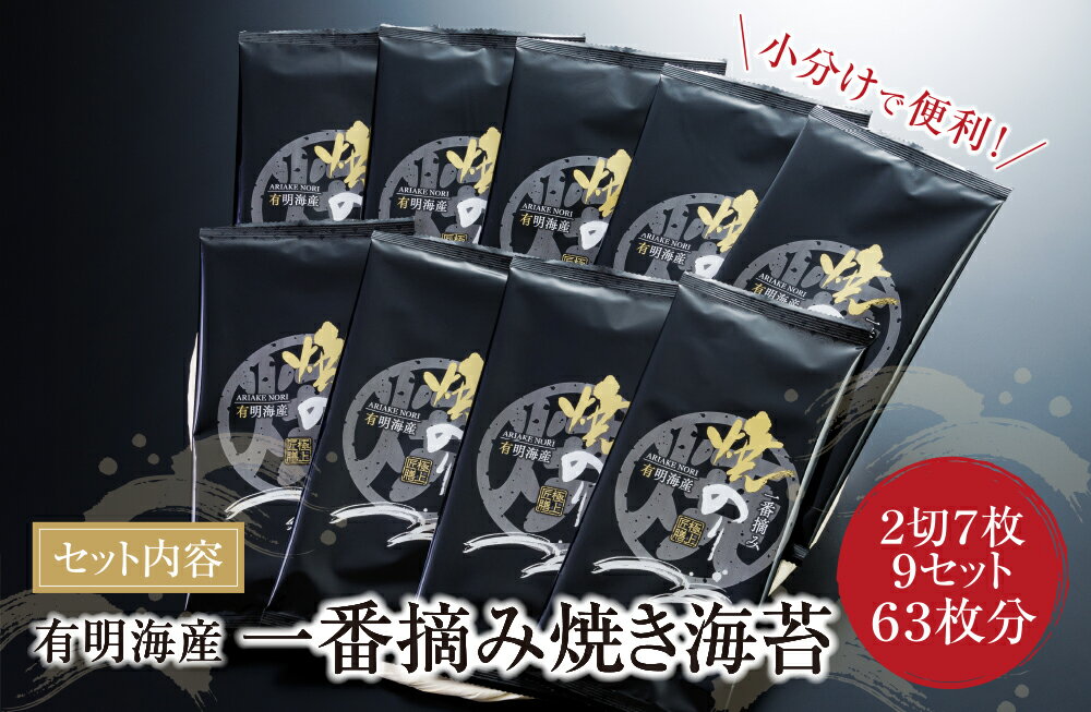 - 【ふるさと納税】 レビューキャンペーン 有明海産 一番摘み 焼きのり 2切7枚×9セット(63枚分) 焼きのり 有明海苔 手巻き寿司 ご飯のお供 福岡県 送料無料