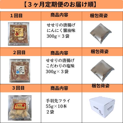 【ふるさと納税】葉牡丹 定期便2 国産 鶏【3ヶ月毎月お届け】 【1回目:せせりの唐揚げ にんにく醤油味300g×3袋 】 【2回目:せせりの唐揚げ 塩味300g×3袋】 【3回目:手羽先フライ 約55g×10本×2袋】/高知県 奈半利町