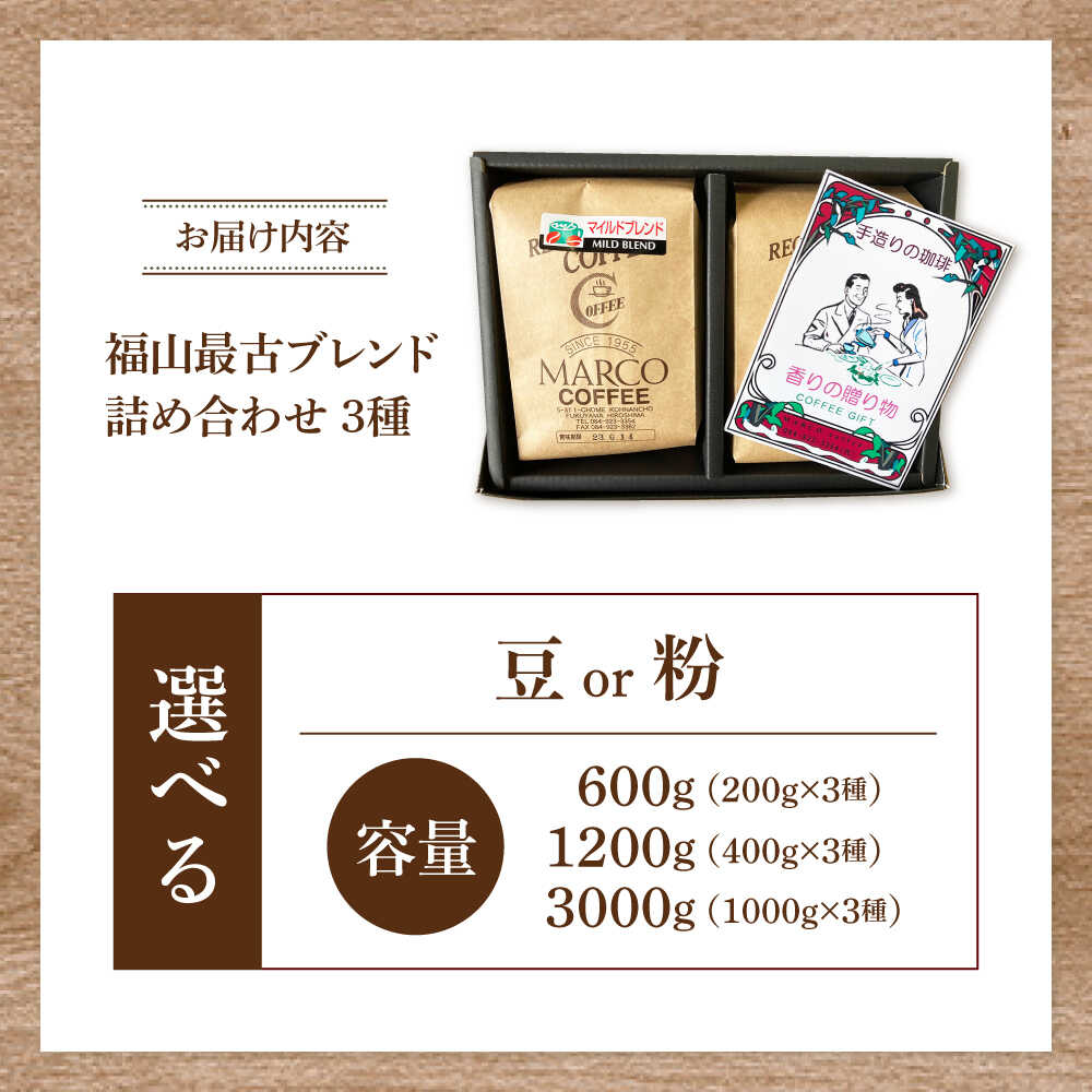 【ふるさと納税】【1955年創業 福山最古の自家焙煎珈琲専門店】マルコ珈琲商会の福山最古ブレンド詰合せ おすすめ 人気 コーヒー豆 珈琲豆 豆のまま 粉 中挽き レギュラーコーヒー ドリップコーヒー ブレンドコーヒー 広島県福山市/マルコ珈琲商会[BABE004]