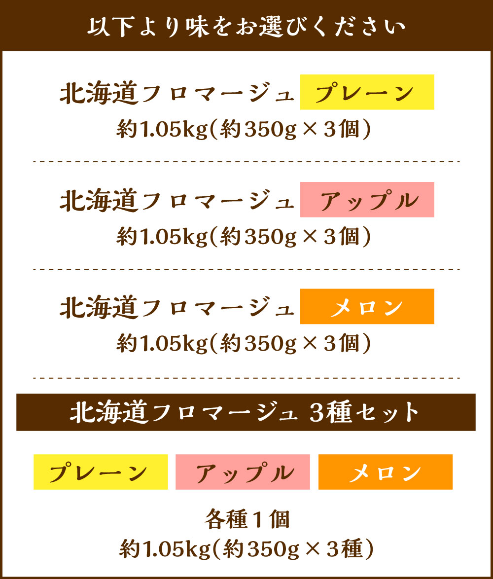 - 【ふるさと納税】<選べる味>北海道フロマージュ プレーン / アップル / メロン / 3種セット 計約1.05kg(約350g×3個) クリームチーズ ベイクドチーズケーキ スイーツ デザート 洋菓子 お菓子 おやつ リンゴ 林檎 赤肉メロン 果物 くだもの フルーツ 果汁 冷凍 送料無料