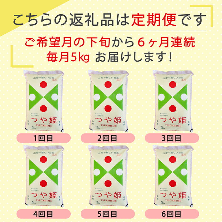 - 【ふるさと納税】≪6ヶ月定期便≫ つや姫 5kg×6ヶ月連続 計30kg 特別栽培米 山形県産 ご希望期間の毎月下旬にお届け 東北 酒田市 庄内地方 精米 白米 ブランド米 ごはん ご飯 連続定期便