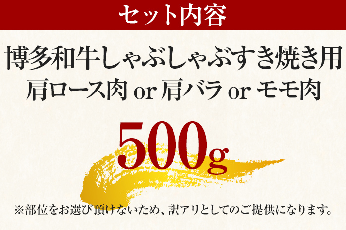 - 【先行予約】訳あり 博多和牛しゃぶしゃぶすき焼き用(肩ロース肉・肩バラ肉・モモ肉)500g 黒毛和牛 お取り寄せグルメ お取り寄せ お土産 九州 福岡土産 取り寄せ グルメ MEAT PLUS CP002er