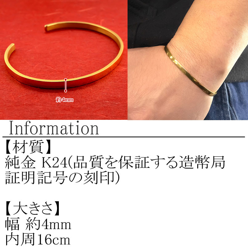 - 24金 ブレスレット 純金 造幣局検定刻印付 ゴールド k24 バングル 腕周り 16cm 4ミリ幅 鍛造 24k 地金 シンプル ジュエリー 山梨県 昭和町 送料無料 管理番号210204105s-16cm SWAA134