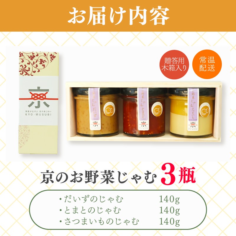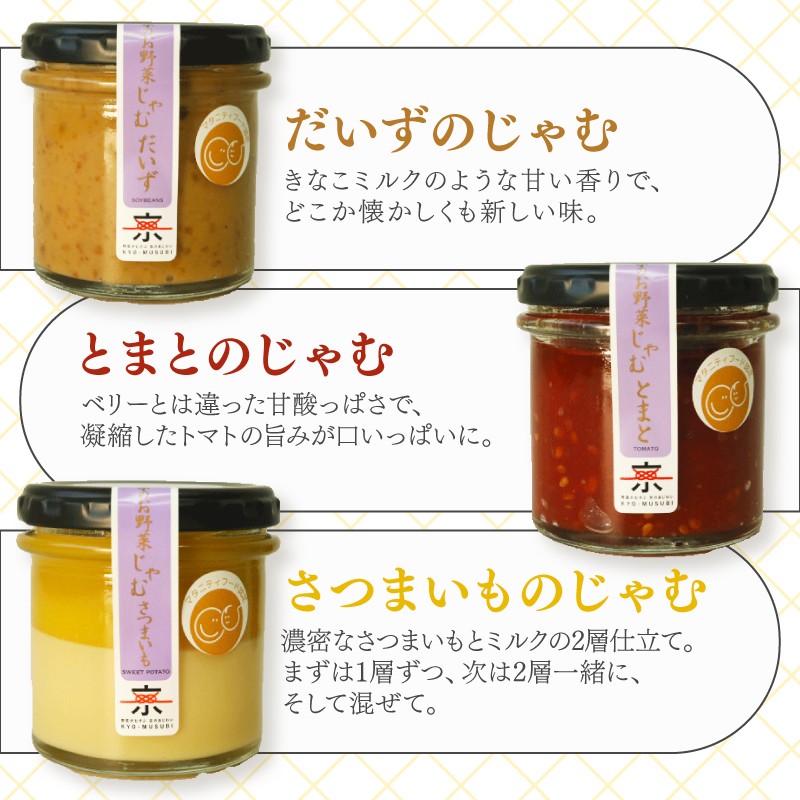 - 京のお野菜じゃむ 3個セット ジャム ( 無添加 野菜ジャム 野菜 京野菜 大豆 トマト さつまいも 食べ比べ 詰め合わせ セット 保存料不使用 加工品 瓶詰め 子ども 赤ちゃん 乳幼児 離乳食 マタニティフード ギフト 贈答用 プレゼント 南丹市 京都 京都府 )