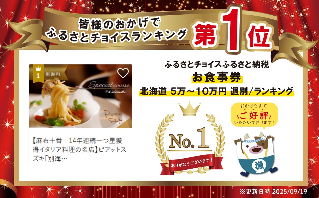 御礼!ランキング第1位獲得!【麻布十番 14年連続一つ星獲得イタリア料理の名店】ピアットスズキ「別海町コース」食事券1名様分 ※2名以上で利用可【CC0000237】( ふるさと納税 レストラン ディナー コース料理 ふるさと納税 食事 ふるさと納税 食事券 東京 ふるさと 食事券 ふるさと 食事 ふるさと 食事券 東京 ふるさと納税 東京 食事券 ふるさと納税 チケット )