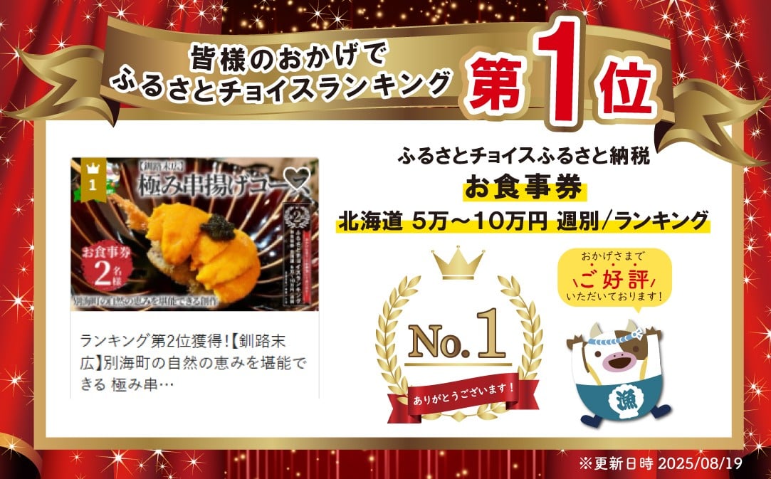 - 御礼!ランキング第1位獲得!【釧路末広】別海町の自然の恵みを堪能できる 極み串揚げコース お食事券2名様(ペア) 北海道(食事券 お食事券 食事券チケット 食事チケット 釧路市 釧路 ディナー 和食 ふるさとチョイス ふるさと納税 仕組み キャンペーン 限度額 計算 ランキング やり方 シミュレーション チョイス チョイスマイル )