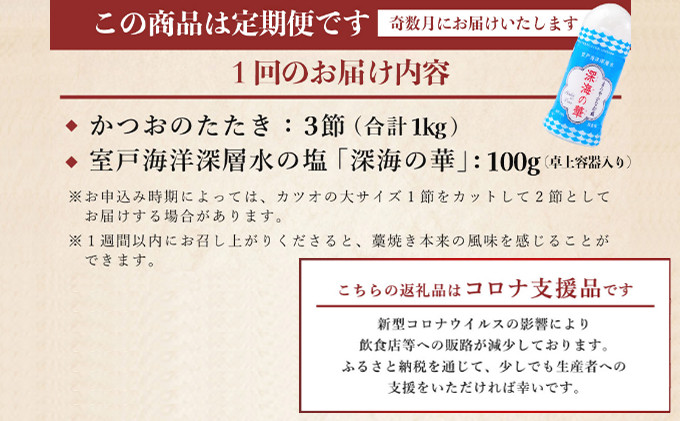 - 【 奇数月 定期便 】 厳選 かつお の 完全 わら焼き たたき 3節入り | 藁焼き カツオ 鰹 高知 かつおのたたき 頒布会 6ヶ月 6回定期便 かつおたたき定期便 魚定期便 高知県定期便 海鮮定期便 かつお定期便 鰹定期便 惣菜定期便 訳あり高知県 室戸市
