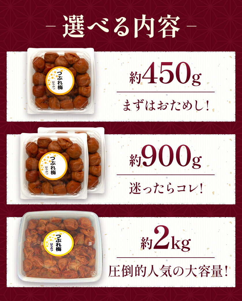 【ふるさと納税】訳あり ご家庭用 とろける果肉 紀州南高梅 はちみつ梅 つぶれ梅 大容量 選べる 450g 900g 2kg 有限会社プラム《30日以内に出荷予定(土日祝除く)》和歌山県 日高町 梅 うめ ウメ 南高梅 梅干し 梅干 つぶれ梅 蜂蜜 紀州 送料無料