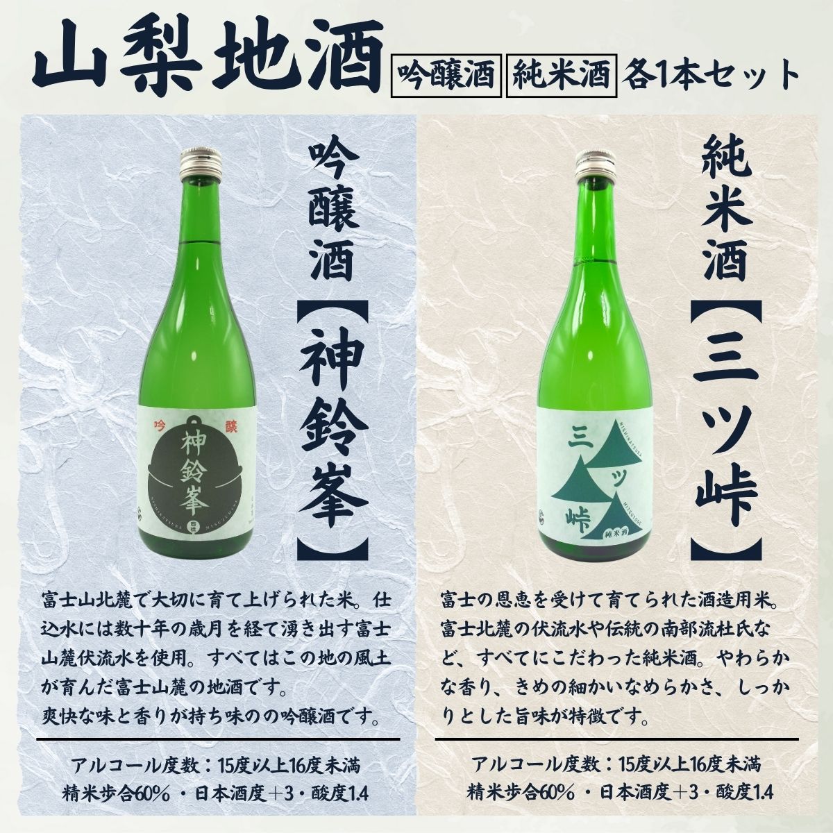- 【ふるさと納税】山梨地酒セット 720ml×2本 純米酒「三ツ峠」 吟醸酒「神鈴峯」 各1本 / 日本酒 お酒 吟醸 地酒 食中酒 富士山 天然水 プレゼント お祝い 記念日 ギフト お歳暮 お年賀