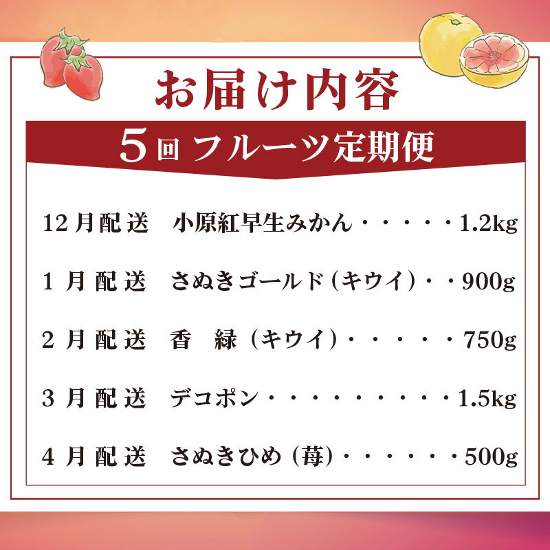 - 【ふるさと納税】 旬のフルーツ 定期便 5回 Aコース 果物 フルーツ いちご 苺 キウイ みかん デコポン 不知火 柑橘 蜜柑 ゴールドキウイ グリーンキウイ ふるさと納税定期便 ふるさと納税フルーツ デザート スイーツ ケーキ ギフト 贈答 送料無料 ふるさと納税 香川県 丸亀市