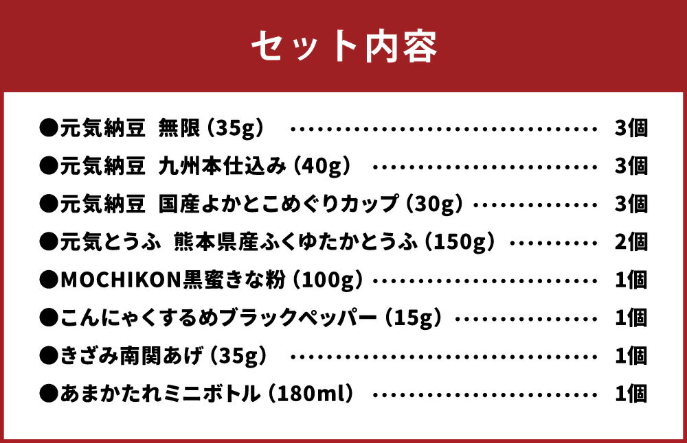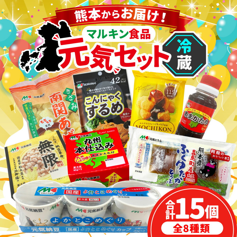 【ふるさと納税】熊本からお届け!マルキン食品元気セット【冷蔵】 8種セット 元気納豆(3種)・元気とうふ・MOCHIKON・こんにゃくするめ・きざみ南関あげ・あまかたれ なっとう 豆腐 コンニャク 蒟蒻 スイーツ スナック たれ タレ 詰め合わせ 九州 熊本県 送料無料