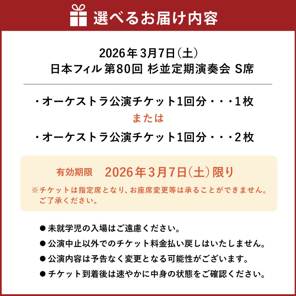 【ふるさと納税】<選べる枚数>3/7(土) 日本フィル第80回杉並定期演奏会 チケット S席 1枚 / 2枚 ペア 入場券 鑑賞券 日本フィルハーモニー交響楽団 オーケストラ コンサート ライブ イベント 音楽 東京都 杉並区 送料無料 【2025年12月上旬~2026年2月下旬発送予定】