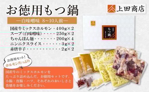 W08-31 上田商店 お徳用もつ鍋セット(白味噌味)8~10人前 国産牛 モツ鍋 ミックスホルモン コラーゲン 冷凍 大容量 博多 福岡グルメ グルメ 鍋 鍋セット モツ鍋 福智町 送料無料 福岡県