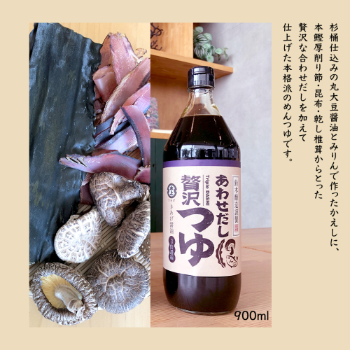 - 丸大豆醤油 ・真壁 ( 900ml × 1本 ) と 贅沢つゆ ( 900ml × 1本 ) の 詰め合わせ きあげ 醤油 木桶仕込み しょうゆ しょう油 つゆ 天つゆ めんつゆ 調味料 国産 丸大豆 小麦 食塩 砂糖 みりん かつおぶし しいたけ 椎茸 昆布 こんぶ 老舗 鈴木醸造 桜川市 [EP007sa]