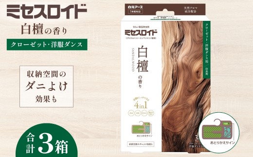 - 防虫剤 ミセスロイド クローゼット・洋服ダンス用 1年防虫 白檀の香り 3個入 3箱セット | 日用品 防虫剤 衣類用防虫剤 白元アース 防虫 消臭 防カビ 黄ばみ防止 防虫対策 収納 衣類 服 衣替え 衣類保管 無香料 長期間防虫 引き出し クローゼット 洋服ダンス 長持ち 白檀 香り 埼玉県 久喜市