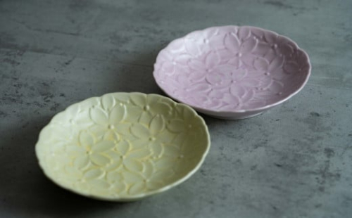 - 【日常に和の優雅さを】有田焼 mint. 桜彫り 12.7cm 深小皿 2枚セット (イエロー・ピンク)【金照堂】小皿 小鉢 副菜皿 副菜鉢 菓子皿 食器 皿 磁器 和食器 A25-639