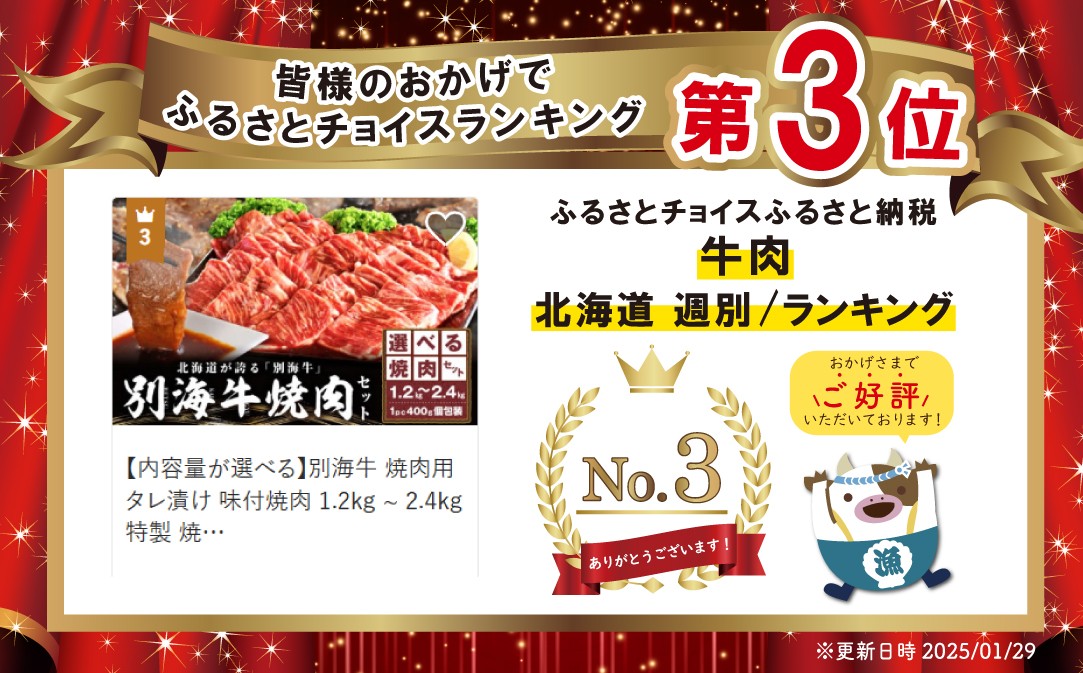 - ランキング第3位獲得!【内容量が選べる】別海牛 焼肉用 タレ漬け 味付焼肉 1.2kg ~ 2.4kg 特製 焼肉用つけだれつき(肉 にく 牛肉 焼肉 国産牛肉 味付け牛肉 味付け牛焼肉 タレ漬け牛肉 特製焼肉 ふるさとチョイス ふるさと納税 仕組み キャンペーン 限度額 計算 ランキング やり方 シミュレーション チョイス チョイスマイル 大容量 焼肉)