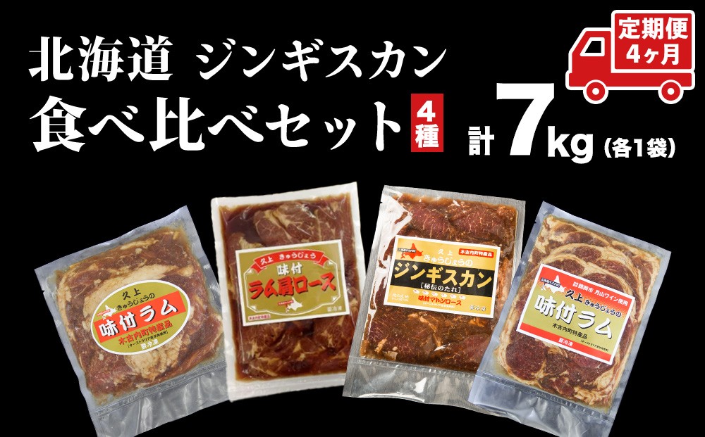 - 【4カ月定期便】 ラム肉 味付き 4種 セット 各1 計7kg 北海道 羊肉 ジンギスカン ラム マトン 肩ロース 月山ワイン 仔羊 ひつじ たれ お肉 焼肉 BBQ バーベキュー ジビエ 冷凍 お取り寄せ ご当地 グルメ ギフト 久上工藤商店 肉 ワイン