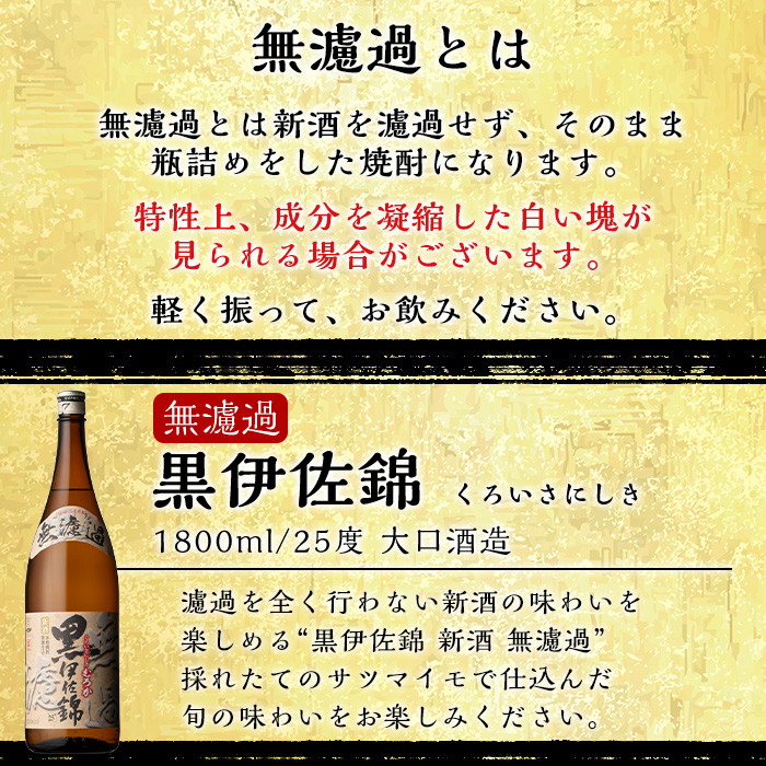 isa526 〈季節限定〉伊佐新焼酎3本セット!伊佐美・黒伊佐錦無濾過・新焼酎伊佐大泉無濾過(1800ml×各1本) 焼酎 伊佐美 黒伊佐錦 伊佐大泉 新焼酎 新酒 無濾過 鹿児島県 伊佐市 お酒 酒 アルコール 贈呈 ギフト プレゼント【坂口酒店】