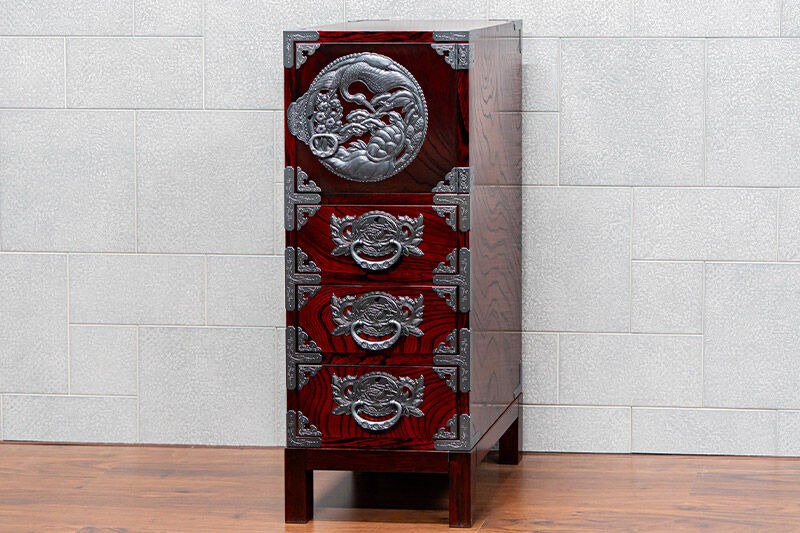 - 仙台箪笥 35巾脚付すきまチェスト 拭き漆塗り【扉:彫金手打金具】(鶴亀松竹梅)(お申込書返送後8ヶ月~12ヶ月程度でお届け)工芸品 伝統|06_kyk-860301