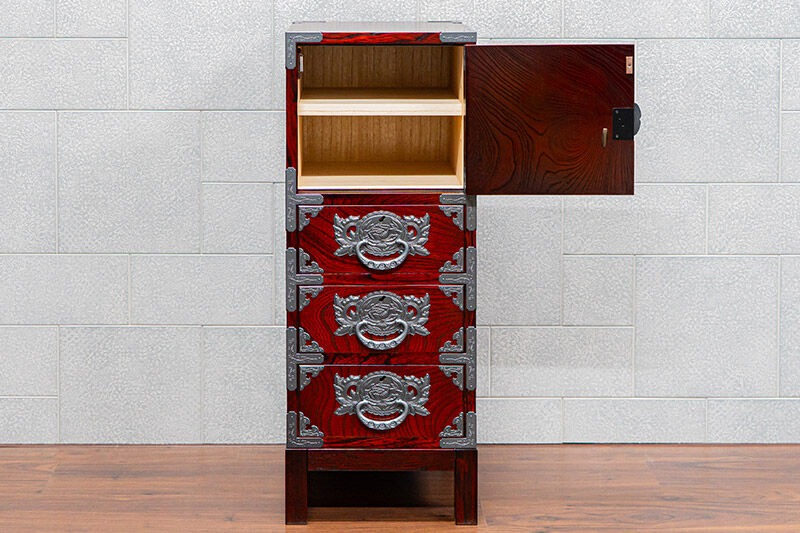 仙台箪笥 35巾脚付すきまチェスト 拭き漆塗り【扉:彫金手打金具】(鶴亀松竹梅)(お申込書返送後8ヶ月~12ヶ月程度でお届け)工芸品 伝統|06_kyk-860301