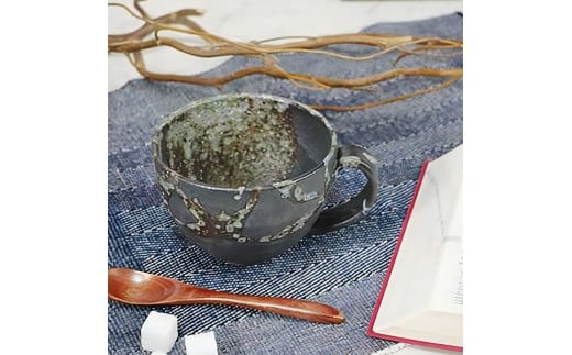 信楽焼 陶器製 丸型スープカップ (黒雹)