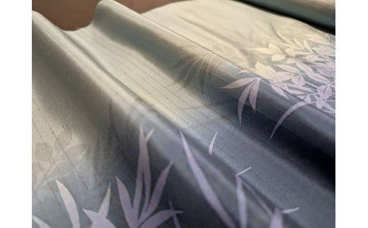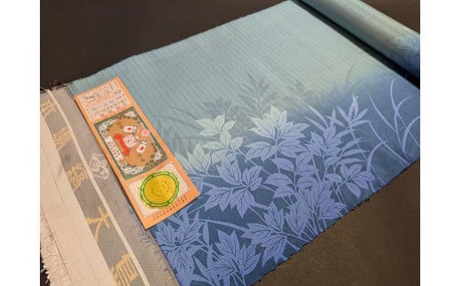 - 【高価な絹糸と大島紬のハイブリッド帯地】本場大島紬 お洒落帯 グラデーションの唐草模様 袋帯 名古屋帯 反物 エメラルドグリーンとロイヤルブルーのツートン【P-390H】