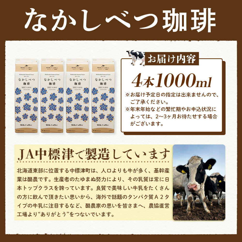 【ふるさと納税】北海道なかしべつ珈琲 1L×4本 コーヒー牛乳 コーヒー 珈琲 牛乳 ミルク 乳製品 乳飲 朝食 お取り寄せ ふるさと納税 北海道 中標津町 中標津【14056】