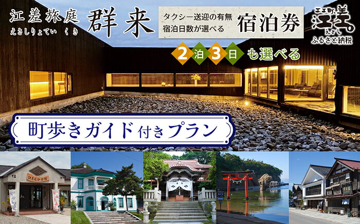 【ふるさと納税】「町歩きガイド付きプラン※期間限定7・8月除く」江差旅庭 群来(くき)宿泊券 [選べる人数・宿泊日数・タクシー送迎有無] 北海道の高級旅館 大人の隠れ家 源泉かけ流し天然温泉宿 個室温泉付き客室 街歩き 観光ガイド 歴史的街並み散策 かもめ島