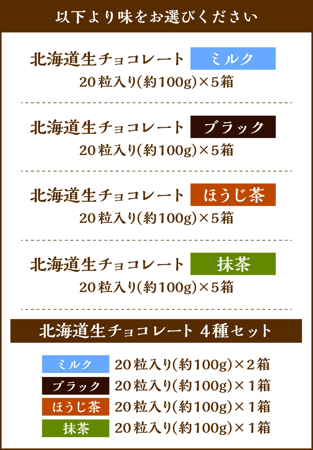 【ふるさと納税】<選べる味>《冷凍》北海道生チョコレート ミルク / ブラック / ほうじ茶 / 抹茶 / 4種セット 計約500g(約100g×5箱) 合計100粒(1箱20粒入り) チョコレート チョコ スイーツ お菓子 洋菓子 デザート おやつ 北海道産 国産 北海道 小樽市 送料無料