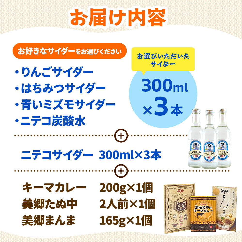 【ふるさと納税】ニテコサイダー3本+【選べる炭酸飲料:りんごサイダー/青いミズモサイダー/はちみつサイダー/ニテコ炭酸水】各3本とたぬ中・キーマカレーのセット・美郷まんまのセット