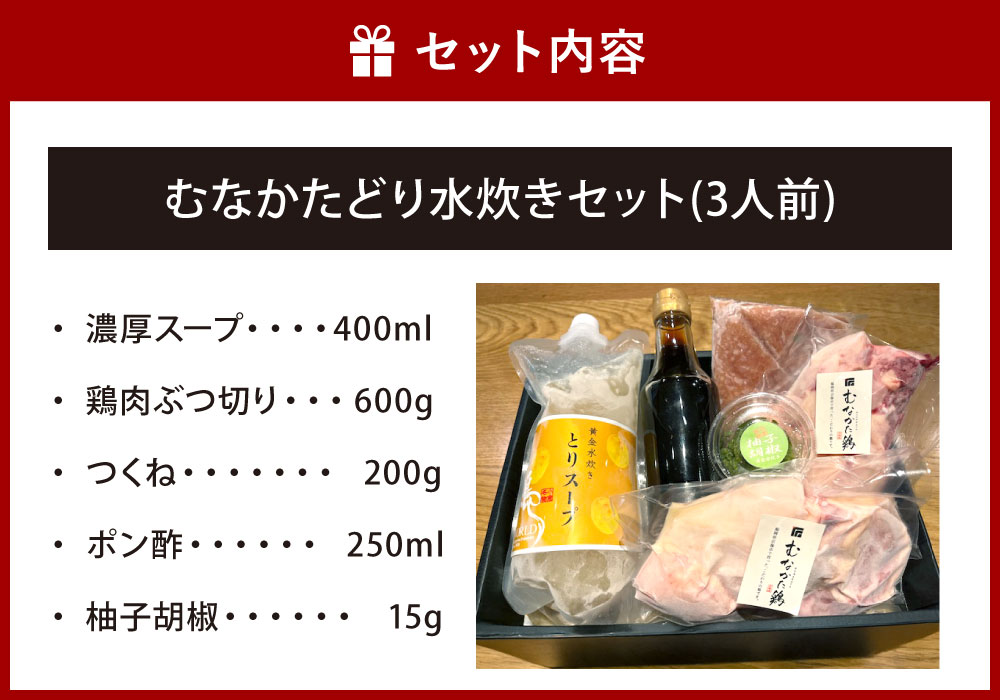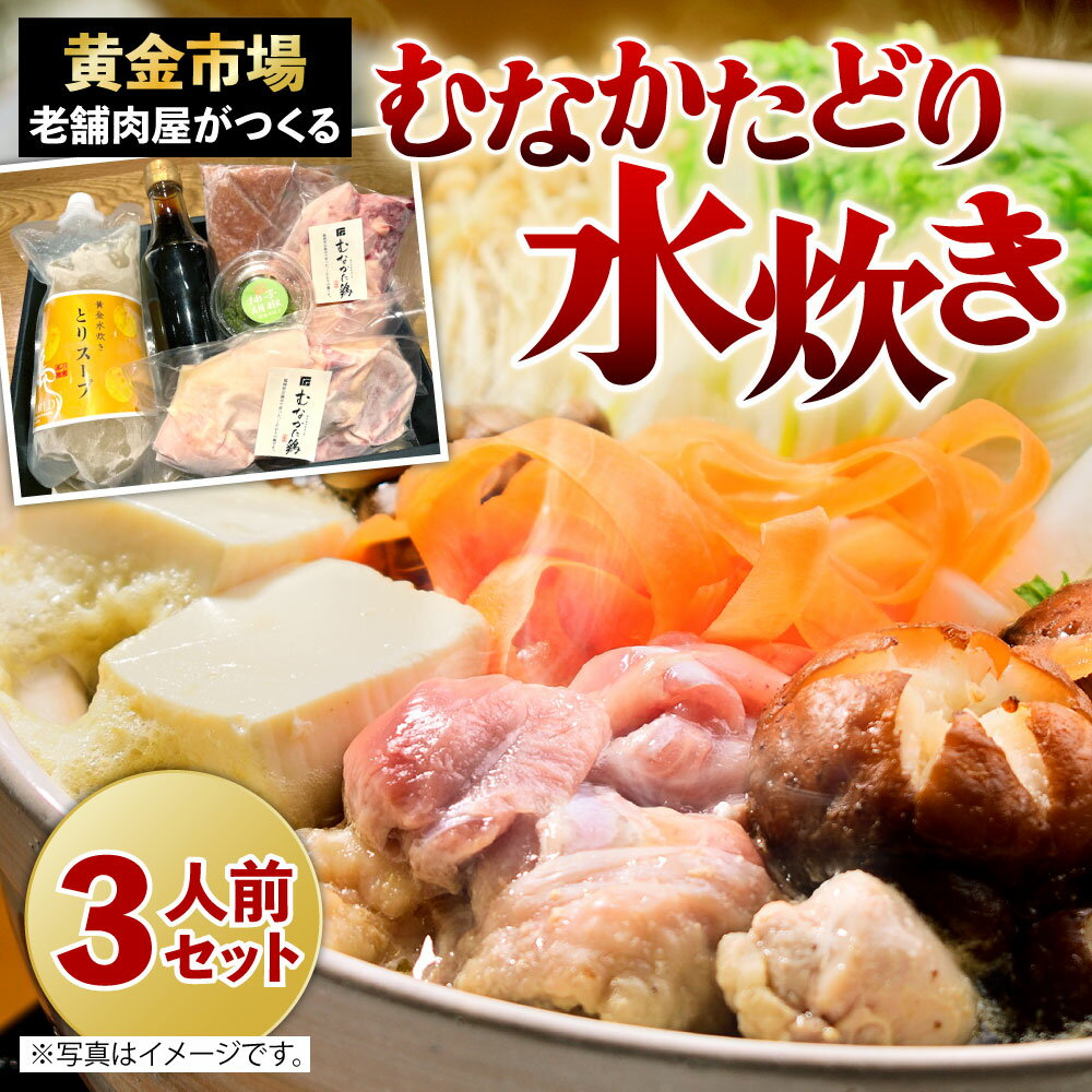 【ふるさと納税】【黄金市場】老舗肉屋がつくる むなかたどり 水炊き セット 3人前 スープ400ml / 鶏肉ぶつ切り600g / つくね200g / ポン酢250ml / 柚子胡椒15g 調理手順書入り 詰合せ お鍋 むなかた鶏 鶏肉 冷凍 福岡県北九州市