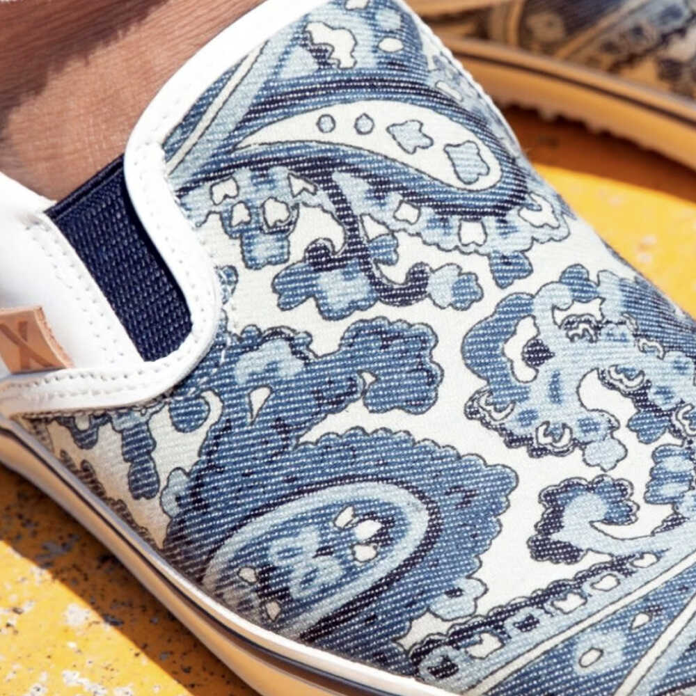 - 経年変化による味わいを楽しむ「デニム抜染(ばっせん)スリッポン」(22.5~28.5cm 7サイズ) ファッション スリッポン デニム 靴 シューズ ペイズリー柄 広島県 福山市