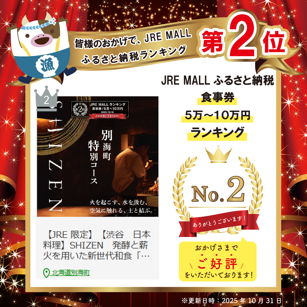 - 【JRE 限定】ランキング第2位獲得!【渋谷 日本料理】SHIZEN 発酵と薪火を用いた新世代和食「別海町ショートコース」お食事券2名様【CC0000178】(ふるさと納税 レストラン 東京 コース料理)