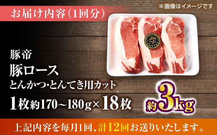 - 【全12回定期便】豚帝 ロースとんかつ・とんてき用 カット 約3kg(1枚約170〜180g×18枚)【KRAZY MEAT(小田畜産)】 [ZCP171]