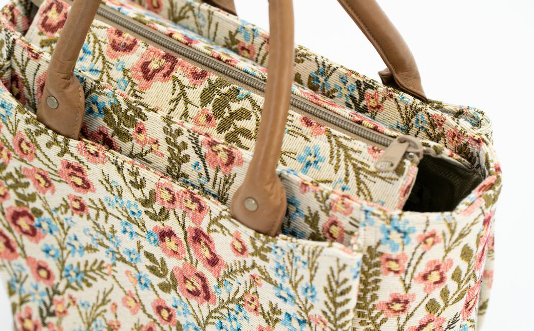 【数量限定】 バッグ 和装のひぐち オリジナル手作りバック65 バック カバン 鞄 かばん 手づくり 手作り ファッション おしゃれ ゴブラン織り お取り寄せ 高知県安芸市 トートバッグ 底幅 14cm 箱型 重厚 可愛い 天然皮革 持ち手 ポケット マグネット 内袋 ファスナー スマートフォン 高さ 21cm 横幅 24cm マチ 11cm 26cm レザー 和風 和柄 安芸市 高知県