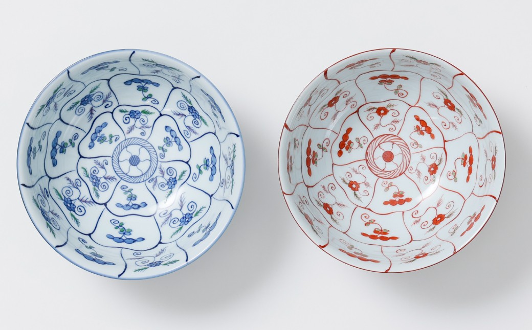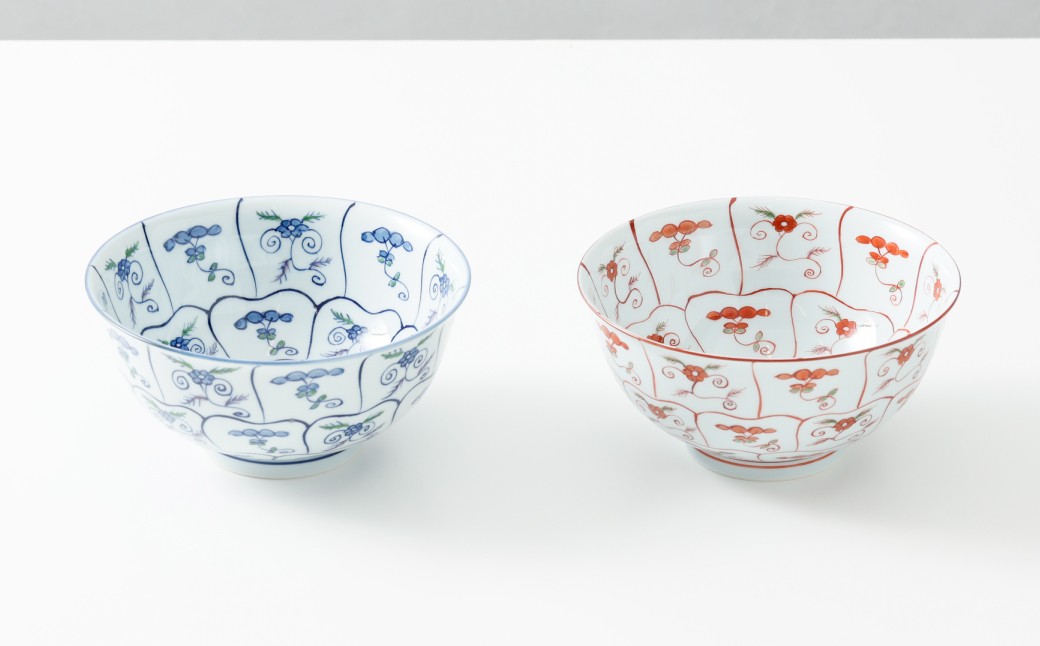 - 【源右衛門窯】有田焼/染錦・赤絵なずな紋麺鉢2客