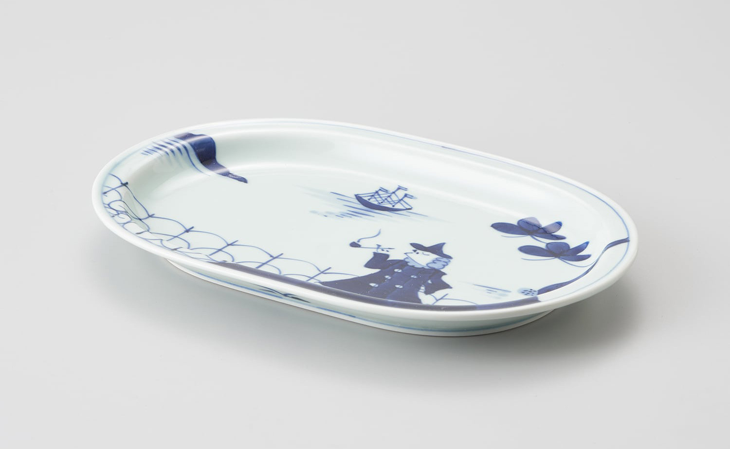 - 有田焼 しん窯 青花 テラス異人小判プレート【小島芳栄堂】食器 うつわ 器 手描き オーバル A22-30