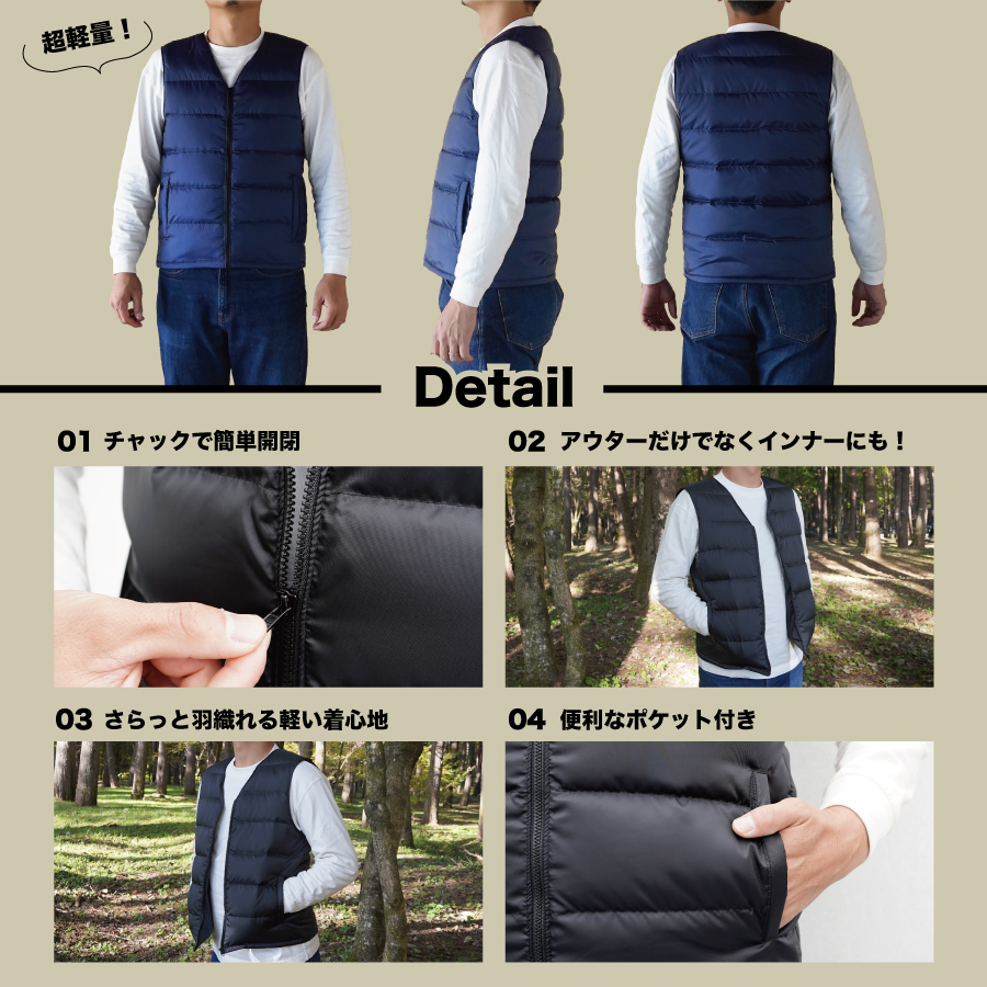 - 高品質 ダウンベスト(薄手)880フィルパワー メンズ 日本製 Mind 羽毛 Lサイズ ネイビー