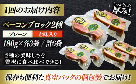加工肉【全3回定期便】 ベーコンブロック セット(プレーン×3ケ 七味入り×3ケ)計6ケ 合計1080g ブランドポーク『オズの箱入り娘』使用! にく 肉 お肉 豚肉 ぶたにく 小分け 切り落としベーコン 燻製ベーコン 自家製ベーコン 焼肉 バーベキュー おかず おつまみ おすすめ 人気 お取り寄せ 送料無料 贈答 ギフト 愛媛県大洲市/株式会社オズメッセ [AGAZ067]