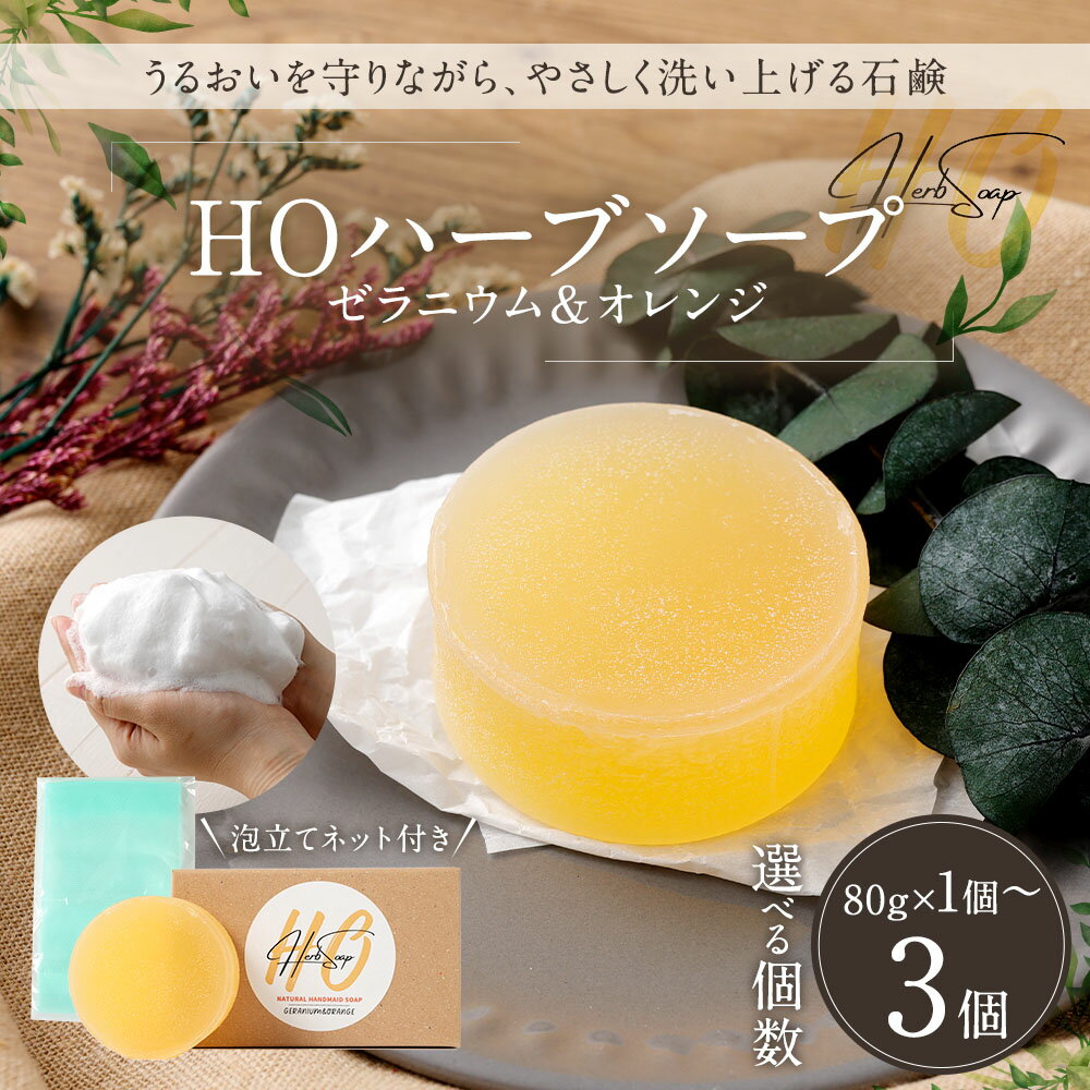 - 【ふるさと納税】<選べる個数>HOハーブソープ(ゼラニウム&オレンジ) 1個・2個・3個セット 1個80g 80g 計160g 計240g 馬油 せっけん 石けん 石鹼 ハーブエキス ゼラニウム精油 オレンジスイート精油 お肌 ハンドケア ボディケア 美容 国産 九州 福岡県 直方市 送料無料