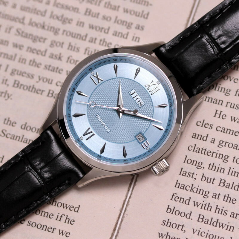 - 【ふるさと納税】JIOS SEIRAN 日本製 自動巻き腕時計 メンズ 男性用 革ベルト ブランド ドレスウォッチ ジオス びわ湖ブルー文字盤 ×<シルバー針または青針より選択可>クロコ型押しベルト(ブラック)