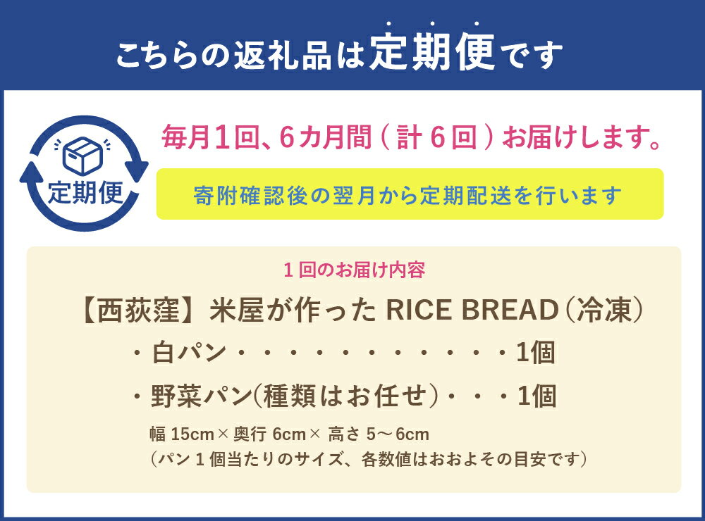 【ふるさと納税】【西荻窪】【定期便6か月】米屋が作ったRICE BREAD(冷凍) 白パン・野菜パン(お任せ)セット 1回あたり計2個(各1個) 1ヶ月毎 6回 パン 精白米 お米 こめ 米油 こめ油 やさい おまかせ 小麦粉・乳・卵不使用 国産 東京都 杉並区 送料無料
