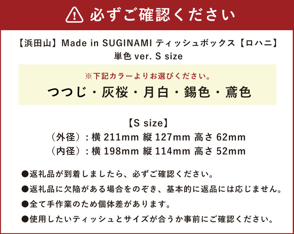 【ふるさと納税】【浜田山】<選べるカラー>Made in SUGINAMI ティッシュボックス【ロハニ】 単色ver. S size 5色展開 ティッシュケース カバー 木製 水性アクリル樹脂100%塗料 詰め替え 日常使い インテリア 家具 小物 雑貨 東京都 杉並区 送料無料