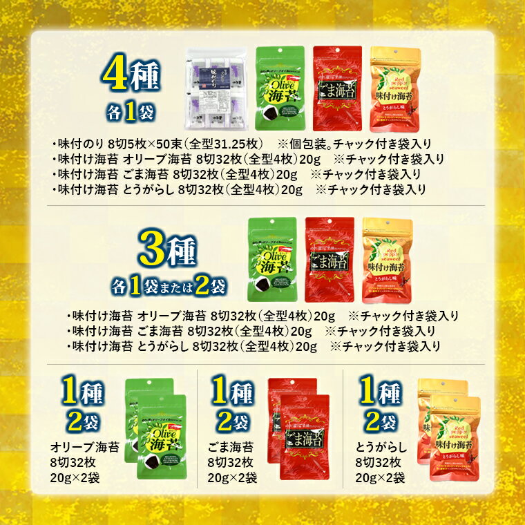 - 【ふるさと納税】海苔 のり 味付 味付け 味付き おすすめ 4種 3種 単品 プレーン オリーブオイル オリーブ ごま ごま油 唐辛子 レッドペッパー 8切 8ツ切り 5000円 10000円 江戸前 国産 ごはん お供 お弁当 おかず おやつ 新富津漁業協同組合 個包装 チャック付き 保存