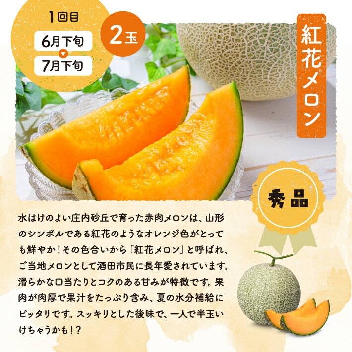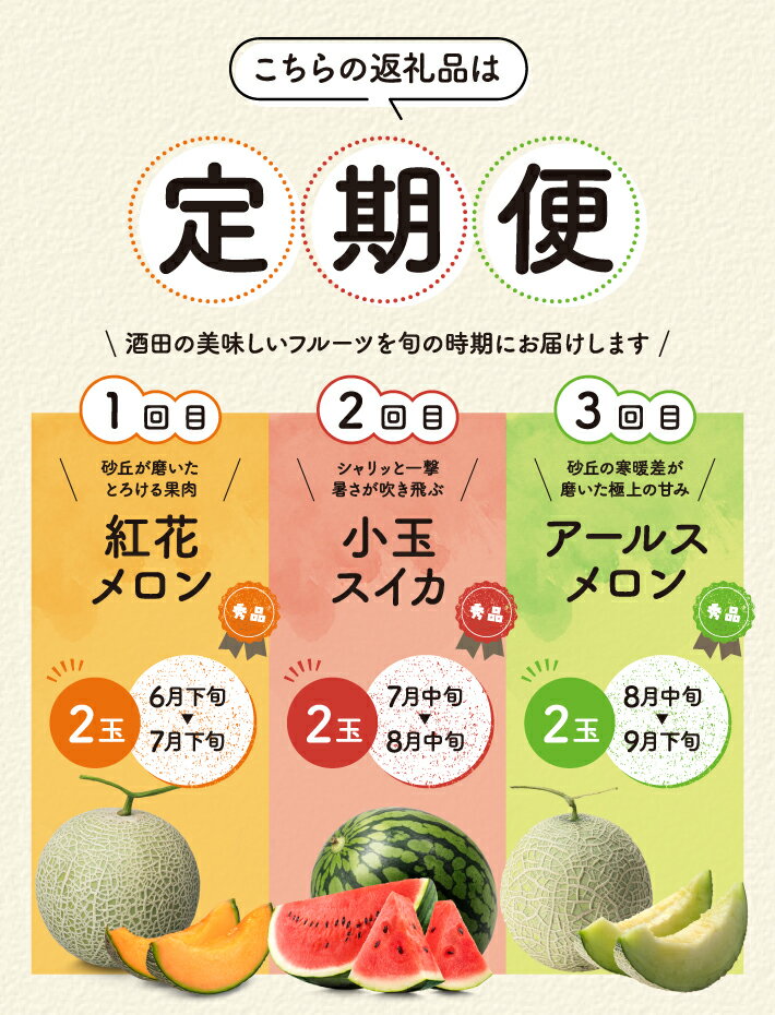 - 【ふるさと納税】≪3回定期便≫ 庄内オイシイ夏の便2026 6月下旬〜7月下旬:紅花メロン 7月中旬〜8月中旬:小玉スイカ 8月中旬〜9月下旬:アールスメロン 計3回 山形県酒田産 ※着日指定不可 頒布会 赤肉メロン 青肉メロン 西瓜 くだもの 果物 フルーツ 夏 旬 食べ比べ