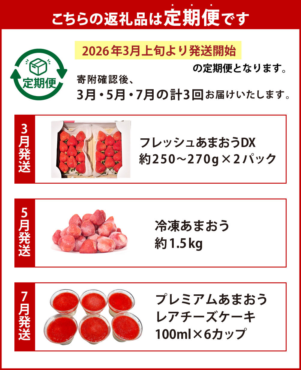 - 【ふるさと納税】予約【3回定期便】あまおう贅沢セット No2【3/5/7月発送】【2026年3月上旬~7月下旬発送予定】あまおうDX 約250~270g×2 合計約500~540g 冷凍あまおう 約1.5kg プレミアムあまおうレアチーズケーキ 100ml×6 太宰府市 送料無料