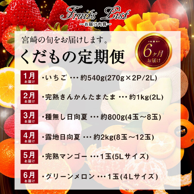 - 【ふるさと納税】《2026年発送先行予約》【数量・期間限定】青果店厳選!「6ヶ月お届け!くだもの定期便Vol.2」 宮崎 フルーツ 果物 定期便 6回 お届け いちご 完熟きんかんたまたま 種無し日向夏 露地日向夏 完熟マンゴー メロン お取り寄せ グルメ 人気 贈答 宮崎県 宮崎市