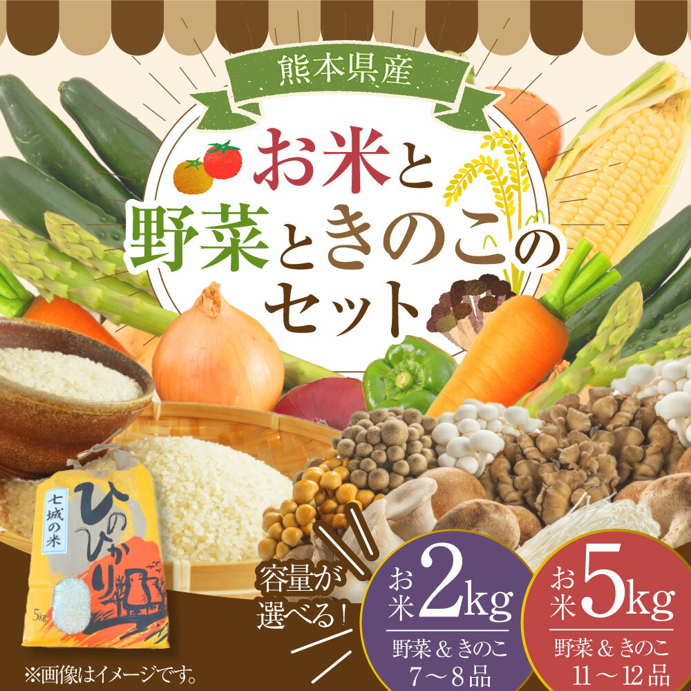 - 【ふるさと納税】<選べる内容量>【令和7年度産】熊本県(七城)産のお米と熊本県産の野菜ときのこ お米(2kg/5kg)・野菜&きのこ(7~8品/11~12品) 精米 単一原料米 ひのひかり ジャガイモ シイタケ 米 キノコ 茸 国産 九州 熊本県 送料無料【2025年11月上旬発送開始】